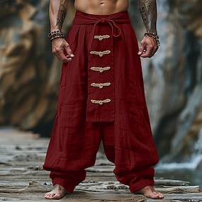 男性用 リネンパンツ ズボン サマーパンツ バギーパンツ ボタン ドローストリング 弾性ウエスト 平織り 履き心地よい 高通気性 全長 ヨガ 日常 ジム用 デザイナー レトリ/ヴィンテージ ルビーレッド ネイビーブルー