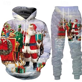 クリスマス メンズ サンタクロース 3D パーカー トラックスーツ パーカー セット 赤 緑 黒 白 赤 紺 フード付き グラフィック サンタクロース 雪だるま 2 ピース プリント スポーツ&アウトドアカジュアル 3Dプリント ストリートウェア デザイナー