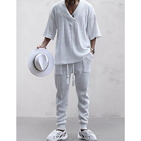 男性用 ワッフルシャツ Tシャツスーツ シャツとパンツのセット 2 ピースの衣装 半袖 クォータージップ 夏 カラーブロック ファッション カジュアル ポケット 2個 バケーション デイリーウェア お出かけ ブラック ホワイト ワイン メンズトップTシャツ