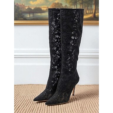 レディースブラックレースニーハイスティレットブーツ - エレガントなゴシックスタイルのハイヒールドレスブーツ、イブニングパーティーに最適、ファッション &フォーマルな機会