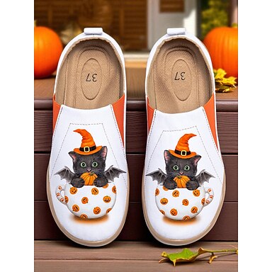 女性用 スニーカー スリッポン プリントシューズ キャンバスシューズ スリッポンスニーカー ハロウィーン アニマル柄 3D フラットヒール ラウンドトウ カジュアル ウォーキング キャンバス ローファー ブラック / ホワイト ブラック&オレンジ ブラック