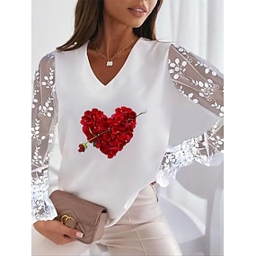 レディース バレンタイン ハート T シャツ レース スプライシング トップ メッシュ エレガント ファッション レース パッチワーク ランタン スリーブ ロング スリーブ レギュラー トップス V ネック パーティー バレンタインデー
