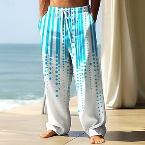 男性用 ズボン バギーパンツ カジュアルパンツ 伸縮性のあるドローストリングウエスト ポケット付きリネン風パンツ 水玉柄 グラデーションストライプ 全長 アウトドア バケーション ストリートファッション ホワイト&ブルー ホワイト+ グリーン 伸縮性なし