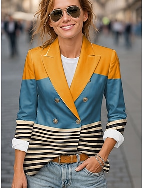 女性用 ブレザー 快適 高通気性 ボタン プリント ファッション カジュアル 幾何学模様 オフィス ストリート カジュアル デイリーウェア ダブルブレスト レギュラー ノッチドラペル レギュラー 長袖 アウターウェア ブラック イエロー ブルー 春 秋
