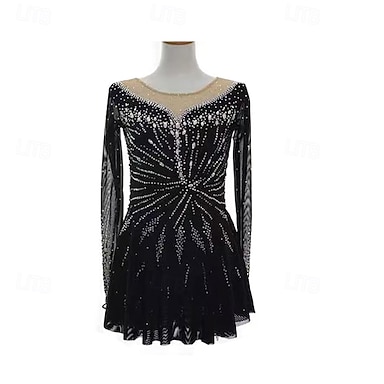 フィギュアスケート ドレス 女性用 女の子 アイススケート ドレス ブラック パッチワーク オープンバック メッシュ スパンデックス 高弾性 訓練 競技大会 スケートウェア クラシック クリスタル・ラインストーン 長袖 アイススケート フィギュアスケート