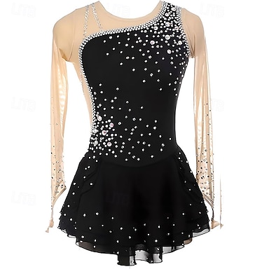 フィギュアスケート ドレス 女性用 女の子 アイススケート ドレス ブラック 指穴付き アシンメトリーヘム メッシュ 高弾性 訓練 競技大会 スケートウェア クラシック クリスタル・ラインストーン 長袖 アイススケート フィギュアスケート