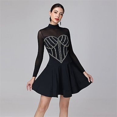 ダンス サルサ ラテン ダンス ドレス クリスタル / ラインストーン 女性用 トレーニング 長袖 ハイ スパンデックス チュール