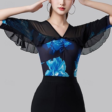 ラテンダンス ボールルームダンス 上着 捺染 スプライシング チュール 女性用 性能 訓練 ハーフスリーブ ハイウエスト ポリエステル