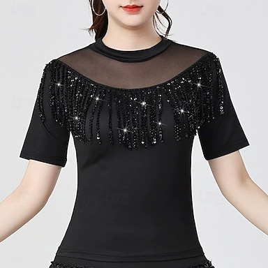 ラテンダンス 上着 ピュアカラー スプライシング スパンコール 女性用 性能 訓練 半袖 ポリエステル
