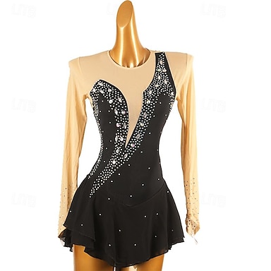 フィギュアスケート ドレス 女性用 女の子 アイススケート ドレス ブラック パッチワーク オープンバック メッシュ 高弾性 訓練 競技大会 スケートウェア クラシック クリスタル・ラインストーン 長袖 アイススケート フィギュアスケート