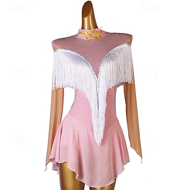 ダンス サルサ ラテン ダンス ドレス ラインストーン タッセル 女性 女の子 パフォーマンス トレーニング 長袖 ハイ スパンデックス チュール