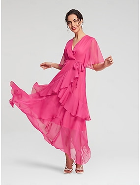 ピンクのシフォンウェディングゲスト/パーティーソリッドフリルスリーブエレガントなマキシドレス、印象的なドレス2024
