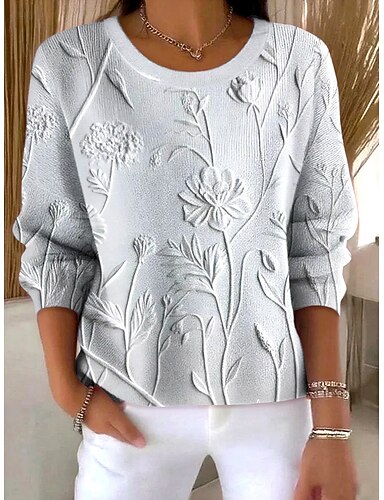 女性用 ニット プルオーバー 日常 カジュアル フラワー グラフィック リブ クルーネック ニット プリント 長袖 レギュラートップス ニット アウトドア 週末 ライトグレー 秋 冬