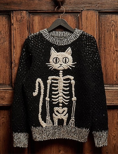 レディースセーター ヴィンテージセーター デイリーカジュアル スケルトン リブ編み クルーネック ニットプリント 長袖 レギュラートップス ニット アウトドア ハロウィン 週末 ブラック 秋 冬