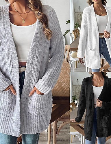 女性用 ニット カーディガン ファッション ストリートファッション 日常 純色 リブ オープンフロント ポケット ニット 長袖 ロングトップス ニット 祝日 お出かけ 週末 ブラック ホワイト 秋 冬