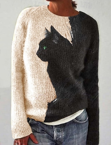女性用 ニット かわいいスタイル カジュアル ソフト 動物 リブ クルーネック ニット プリント 長袖 レギュラートップス ニット アウトドア 日常 週末 ブルー ブラウン 秋 冬