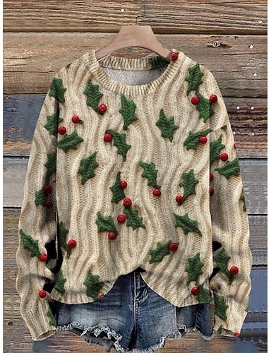 女性用 ニット プルオーバー 日常 カジュアル フラワー グラフィック リブ クルーネック ニット プリント 長袖 レギュラートップス ニット アウトドア 週末 グリーン 秋 冬