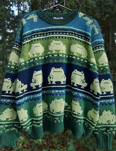 女性用 ニット プルオーバー 日常 カジュアル グラフィック 動物 リブ クルーネック ニット プリント 長袖 レギュラートップス ニット アウトドア 週末 グリーン 秋 冬