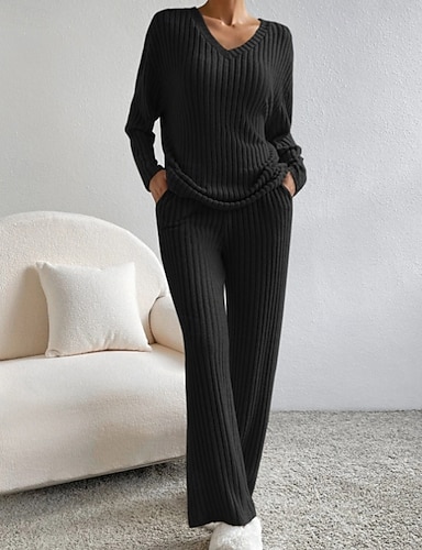 女性用 ニット カジュアル ソフト ピュアカラー リブ Vネック ニット 長袖 レギュラートップス ニット アウトドア 日常 週末 ブラック ピンク 秋 冬