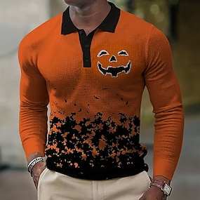 Halloween 男性用 カボチャ ワッフルポロシャツ 長袖 ポロシャツ 襟付きシャツ カジュアル 暗い デイリーウェア フェスティバル衣装 3Dプリント ボタン 春 秋 冬 オレンジ