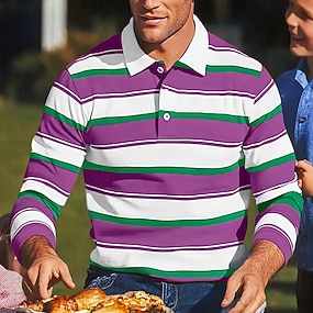 男性用 カラーブロック 縞柄 ラグビーポロシャツ 長袖 ポロシャツ ラペル クラシック ファッション 3Dプリント 近代の カジュアル スポーツ 縞柄 秋 冬 イエロー ルビーレッド パープル