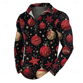 クリスマス 男性用 各 スノーフレーク柄 ジップポロシャツ 長袖 ポロシャツ ラペル カジュアル アウトドア フェスティバル衣装 3Dプリント 秋 冬 ブラック ルビーレッド グリーン