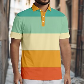 男性用 水平ストリップ ラグビーポロ 半袖 ポロシャツ 襟付きシャツ カジュアル 学校 アウトドア アスレイジャー デイリーウェア ボタン 3Dプリント 夏 ブルー オレンジ