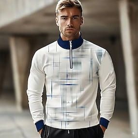 男性用 幾何学模様 ライン ポロ 長袖 ポロシャツ ラペル ビジネスカジュアル アスレイジャー デイリーウェア 3Dプリント クォータージップポロ 春 秋 冬 ブラック ホワイト ブルー