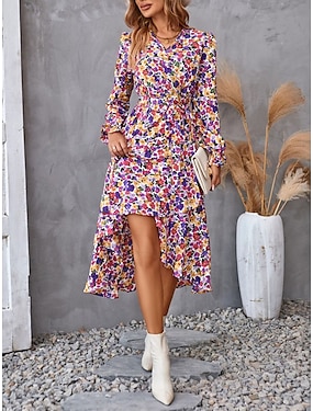 女性用 ミディドレス カジュアルドレス スイングドレス ラップドレス A ラインドレス カジュアル 日常 レギュラー フラワー 長袖 Vネック ブラック パープル グリーン 夏 春 秋