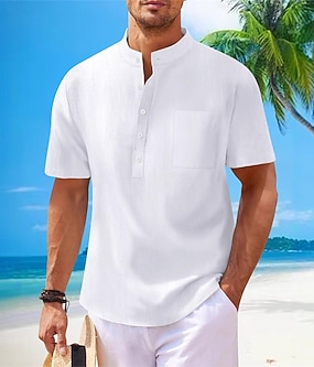 男性用 シャツ リネンシャツ カジュアルシャツ ボタンアップシャツ 平織り バケーション ストリート ブラック ホワイト ブルー カーキ色 半袖 フード付き 夏 衣類 調節可能な巾着フード
