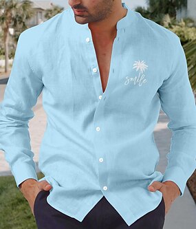 男性用 シャツ リネンシャツ ミニマリストアロハシャツ チャイナカラーシャツ マンダリンカラーシャツ ポップオーバー シャツ ココナッツの木 バケーション ハワイアン ブラック ブルー 長袖 スタンド 春 & 秋 衣類