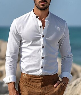 男性用 シャツ チャイナカラーシャツ マンダリンカラーシャツ カジュアルシャツ ボタンアップシャツ コットンシャツ 平織り バケーション ハワイアン ブラック ホワイト ピンク ネイビーブルー 長袖 グランダッドカラー 春 & 秋 衣類 ボタンダウン
