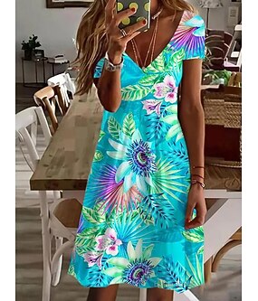 女性用 ミニドレス カジュアルドレス 花柄ドレス 自由奔放に生きるドレス スタイリッシュ クラシック 近代の バケーション 日常 デート レギュラー フラワー プリント ハーフスリーブ Vネック ピンク ブルー グリーン 夏 春
