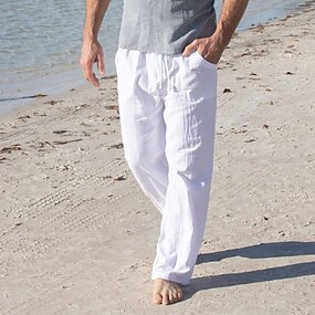男性用 リネンパンツ ズボン サマーパンツ バギーパンツ ビーチパンツ ドローストリング フロントポケット まっすぐな足 平織り 履き心地よい 高通気性 全長 ヨガ 祝日 ビーチ ファッション ハワイアン ホワイト ネイビーブルー