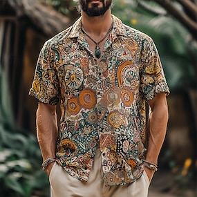 男性用 インディアン(ネイティブアメリカン) ボヘミアン エスニック シャツ アロハシャツ ボタンアップシャツ 半袖 ハワイアン バケーション 祝日 ビーチウェア 夏 春 折襟 3Dプリント 襟付きシャツ イエロー