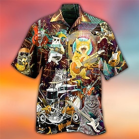 男性用 猫 ギター シャツ アロハシャツ 半袖 シャツ 折襟 トロピカル風 ファッション ハワイアン カジュアル ハワイアン 祝日 イエロー ブルー ライトパープル S M L