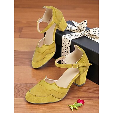 アンクルストラップとパールチャーム付きのレディースイエロースエードブロックヒールパンプス - 結婚式やカクテルパーティーに最適な1950年代のエレガントなヴィンテージレトロドレスシューズ &イブニングウェア