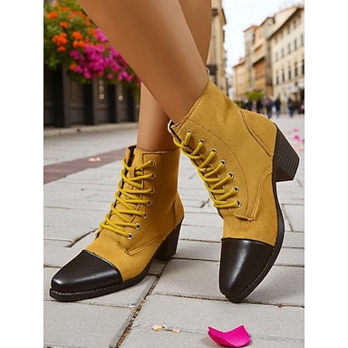 レディースイエローのレースアップアンクルブーツ(つま先キャップは黒) - ヴィンテージレトロスタイルのショートブーツ。カジュアルな服装、ストリートウェア、秋のファッションにぴったり。