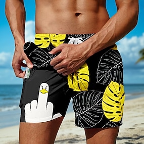 男性用 おかしい あひる シュロの葉 裏地付きショートパンツ 2 in 1 スイムショーツ スイムショーツ ミディアムウエスト ハワイアン バケーション 祝日 ビーチウェア サイドポケット コンプレッションライナー付き 伸縮性のあるドローストリングウエスト デザイナー 衣類