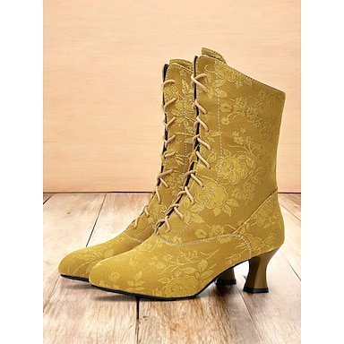 女性用イエロージャカード編み上げアンクルブーツ、チャンキーヒール - 19世紀後半のビクトリア朝スタイルのバロック調ショートブーツ。秋の装い、コスチュームパーティー、快適なウォーキングに最適です。