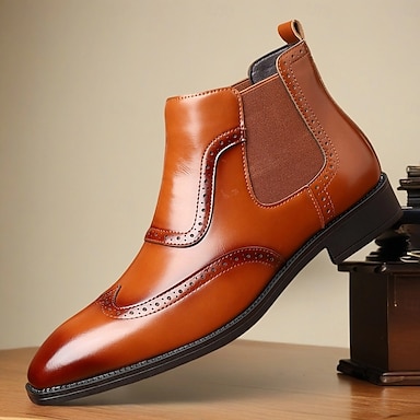 メンズ バーガンディ フェイクレザー ウィングチップ チェルシーブーツ – 紳士、秋の装い、セミフォーマルなイベントに最適なクラシックなブローグアンクルブーツ
