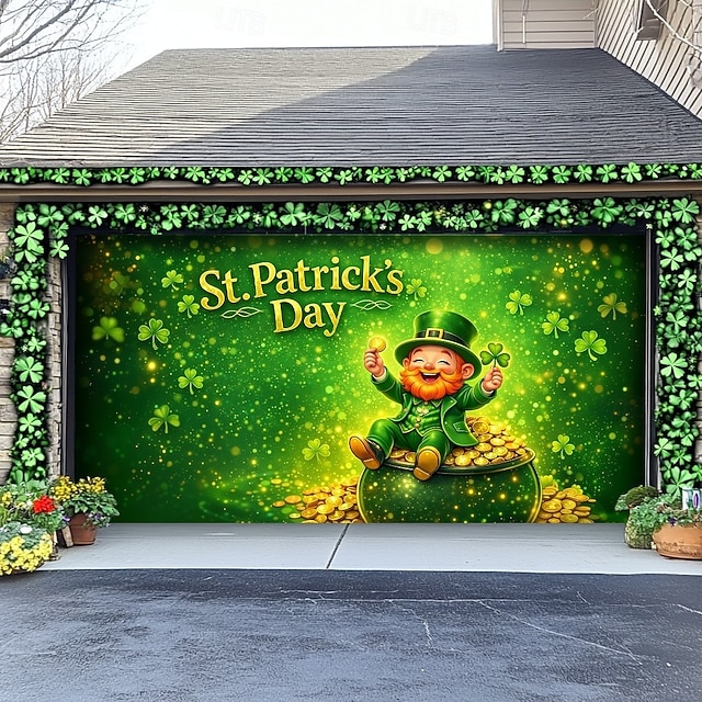 聖パトリックの日のガレージドアの装飾、金の壺を持った陽気なレプラコーン &クローバー、聖パトリックの日のお祝いにぴったりのお祭りカバー。 #11253014