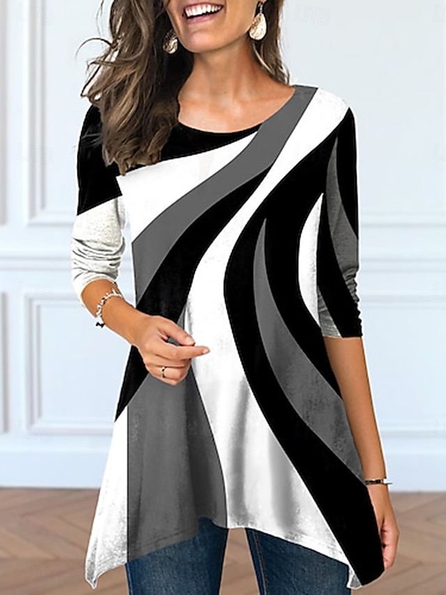 女性用 Tシャツ プリント アシメントリー グラフィック 幾何学模様 ヴィンテージ スタイリッシュ カジュアル 長袖 クルーネック ロングトップス 日常 ブルー ホワイト ダスティブルー グレー 夏 春 #11278857