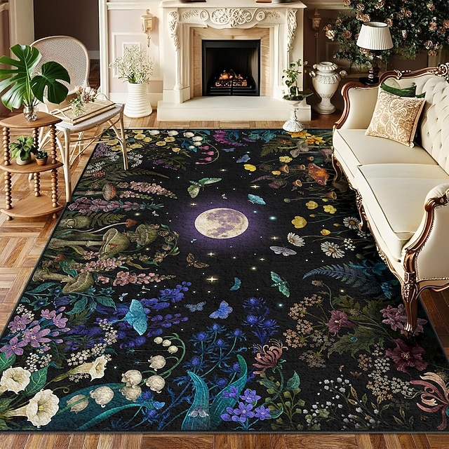 満月と花柄、キノコをモチーフにしたエリアラグ。植物と神秘的な庭園のデザインが特徴で、エレガントで耐久性のある装飾品として、episodic drawing が制作しました。 #12199321