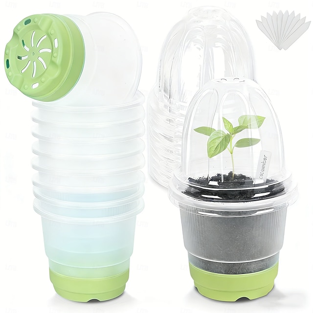 蓋付きスタータートレイと植物ラベル付きの4インチ苗カップ10個、透明な苗ポット、補強されたベース付きの再利用可能なプラスチック植木鉢、移植が簡単 &種まき #12517122