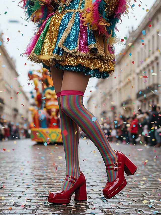 女性用マルディグラ カラフルレインボー 膝上ソックス 4パック - ストレッチストライプ カーニバルコスチュームストッキング、カーニバルとパーティー用の鮮やかなフェスティバルスタイル