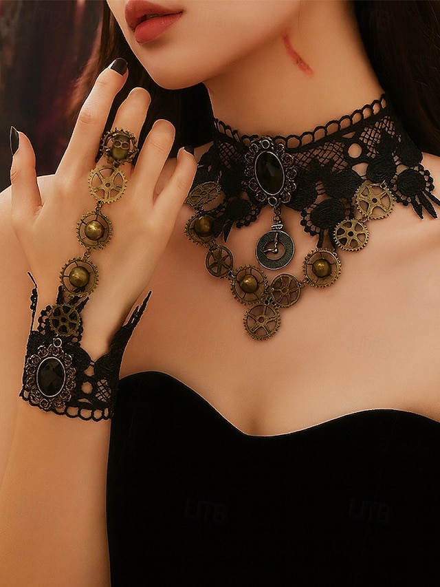ウィメンズ マルディグラ ブラック レース スチームパンク チョーカーネックレスとブレスレットセット - ゴシックコスプレ、カーニバル、ハロウィンコスチューム用の合金ギアと時計ペンダント #15476138