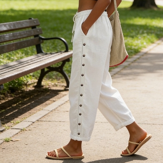 女性用 コットン ズボン サマーパンツ ビーチパンツ 旅行度假风 ファッション カジュアル 普段着 足首丈 ハイウエスト 平織り 弾性ウエスト サイドボタン ライトウェイト 快適 高通気性 伸縮性なし ストリートウェア ビーチ 祝日 ブルー ブラック ホワイト カーキ色 夏 春 秋 レギュラー #16039743