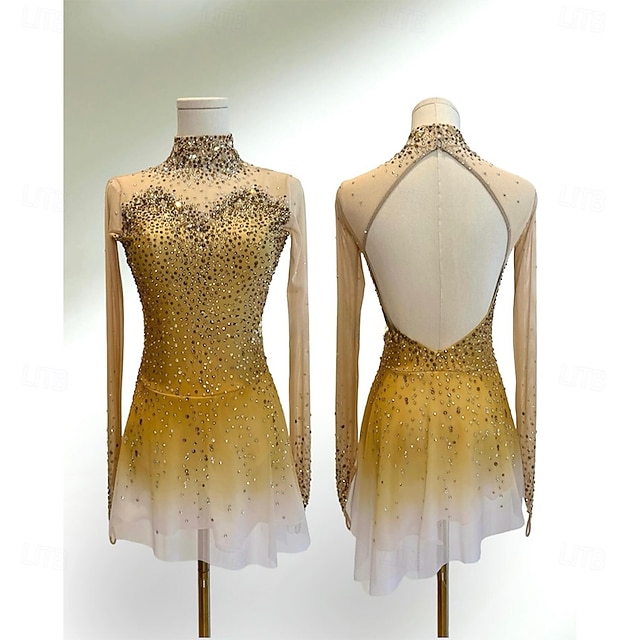 フィギュアスケート ドレス 女性用 女の子 アイススケート ドレス イエロー パッチワーク 指穴付き スパンデックス メッシュ 高弾性 訓練 競技大会 スケートウェア クラシック クリスタル・ラインストーン 長袖 アイススケート フィギュアスケート #16121703