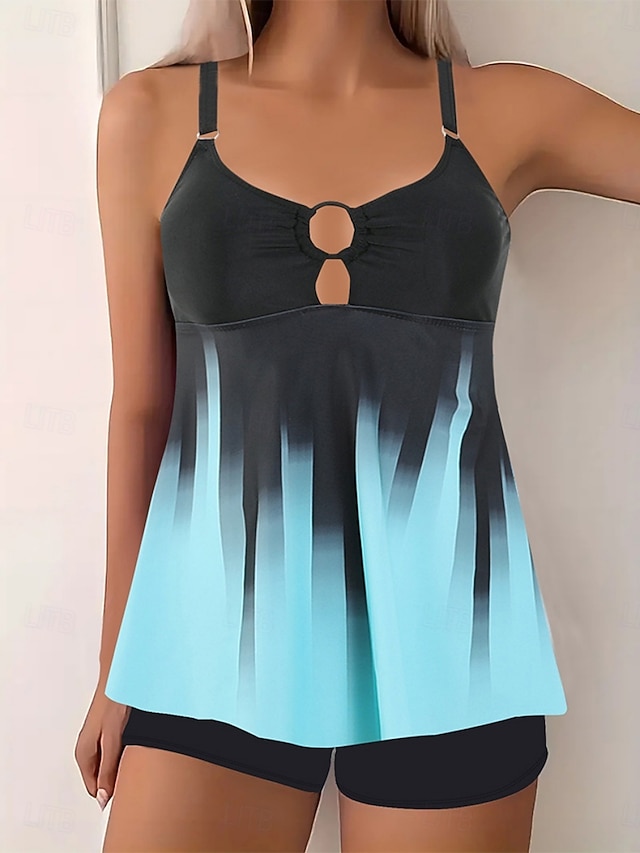 ウィメンズ タンキニ 2ピース 水着 ブリーフ アクティブ バケーション オンブレ グラフィック U ネック ノースリーブ 水着